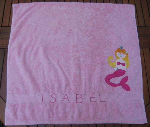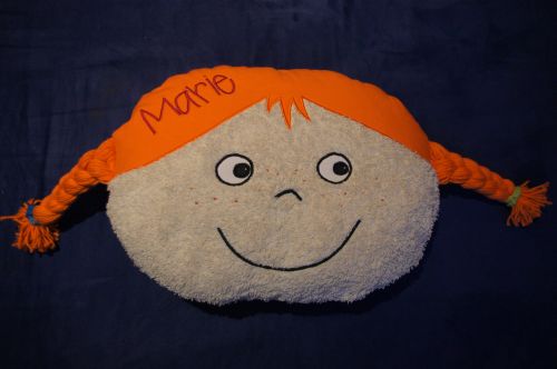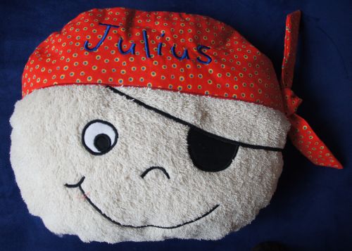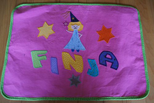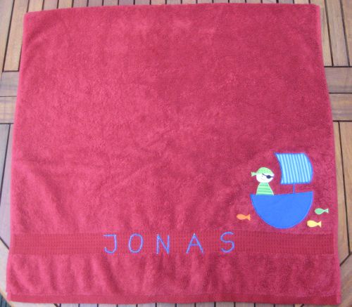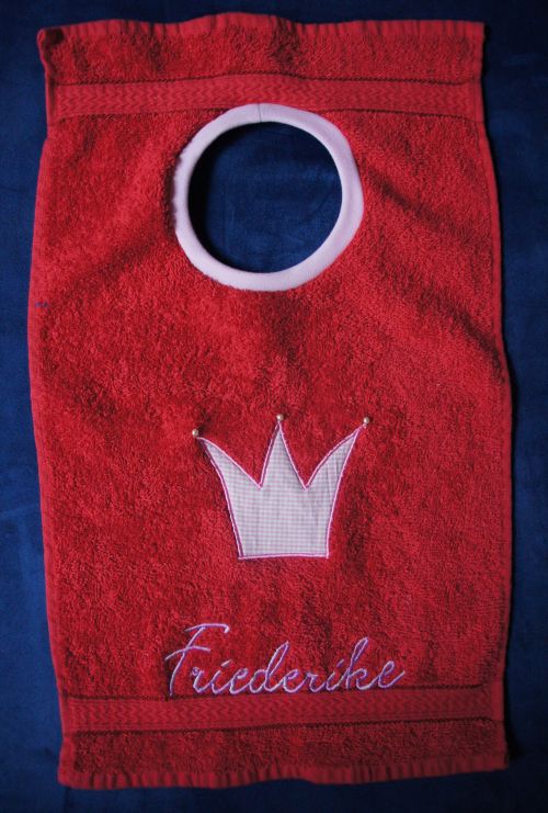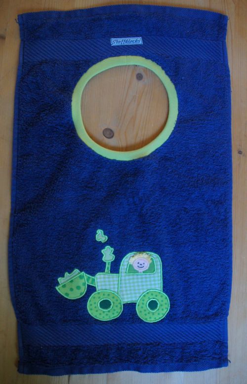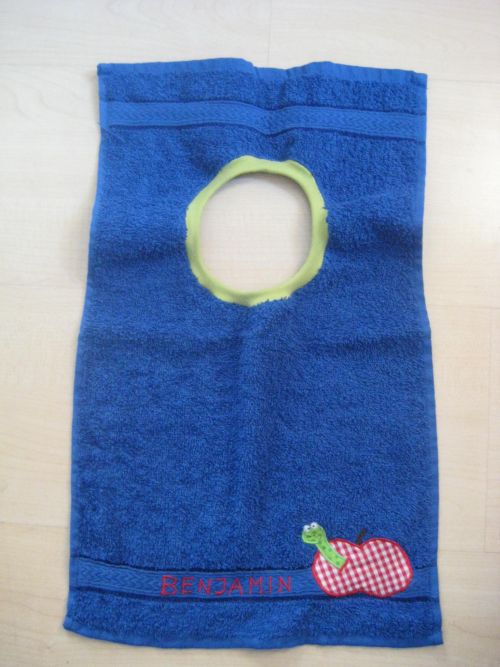 Lätzchen aus einem Gästehandtuch mit eingearbeitetem Bündchen, Applikation und gesticktem Namen.