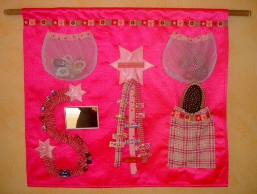 Haarschmuckaufbewahrung Modell "Sterntaler"Auf pinkfarbenem Glanzstoff zum Aufhängen. Mit zwei Netztaschen für
